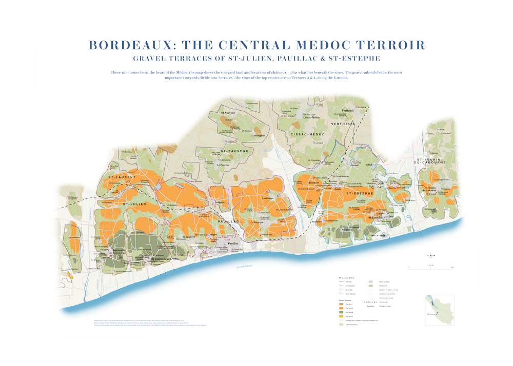 These maps formed the basis for the maps in Jane Anson’s Inside Bordeaux (2020). They go a stage further, adding wholly new soil and geology information, under the aegis of Prof. Kees van Leeuwen, to the updated and extended topography and châteaux maps.